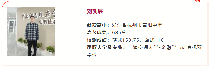 大家好,我是来自浙江省富阳中学的刘劢辰,本科考入了上海交通大学的金融学及计算机双学位。在高中时,我课内成绩优秀,成绩经常位列年级前三名。并且我在高中时曾经参加过物理竞赛,在第40届全国物理奥林匹克竞赛中获得二等奖。此外,我多次参加过清华大学的夏令营与冬令营,这段经历也使我更好地开拓了自己的视野。