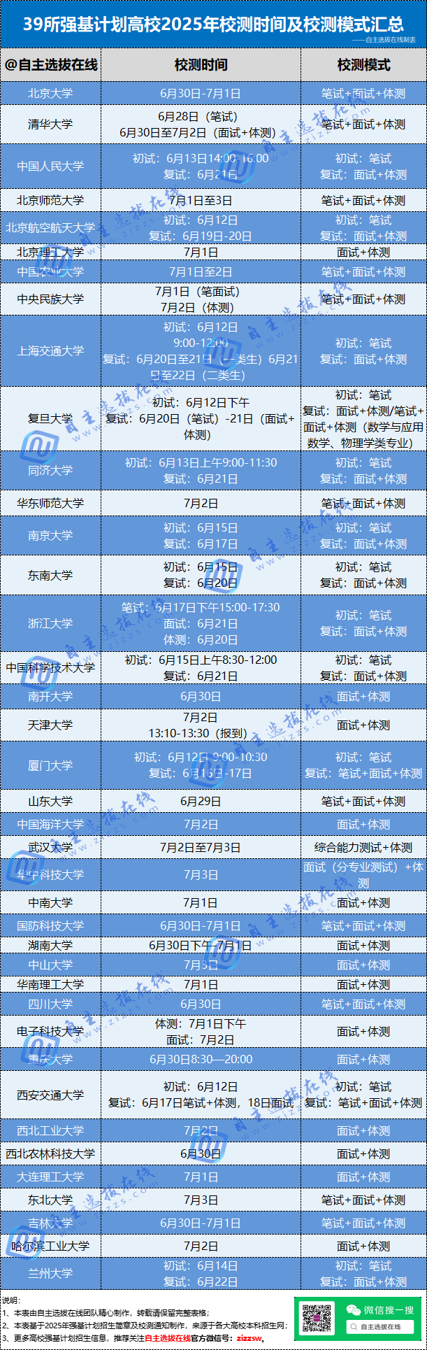 2025年复旦、上海交大、南大、浙大、中科大、人大、北航、同济、西安交大、东南大学、厦大、兰大12校校测安排在高考后、高考出分前进行,所有报名考生均参加校测,相当于全员“破格式入围”。