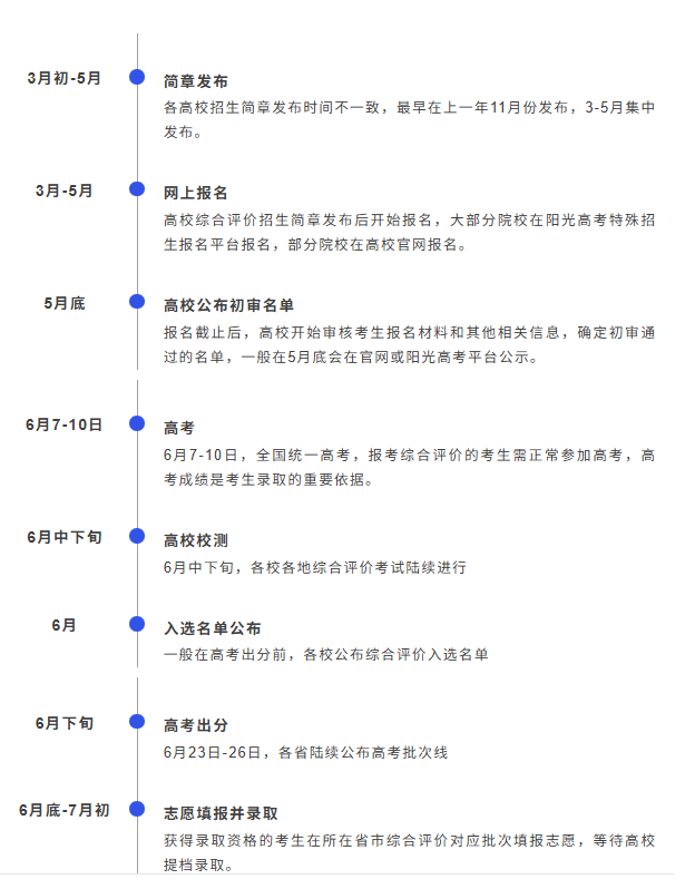 简章发布:高校综合评价招生简章发布时间不一致,主要集中在4月底至5月,也有部分高校如上海纽约大学、昆山杜克大学等会在上一年年底启动报名。
