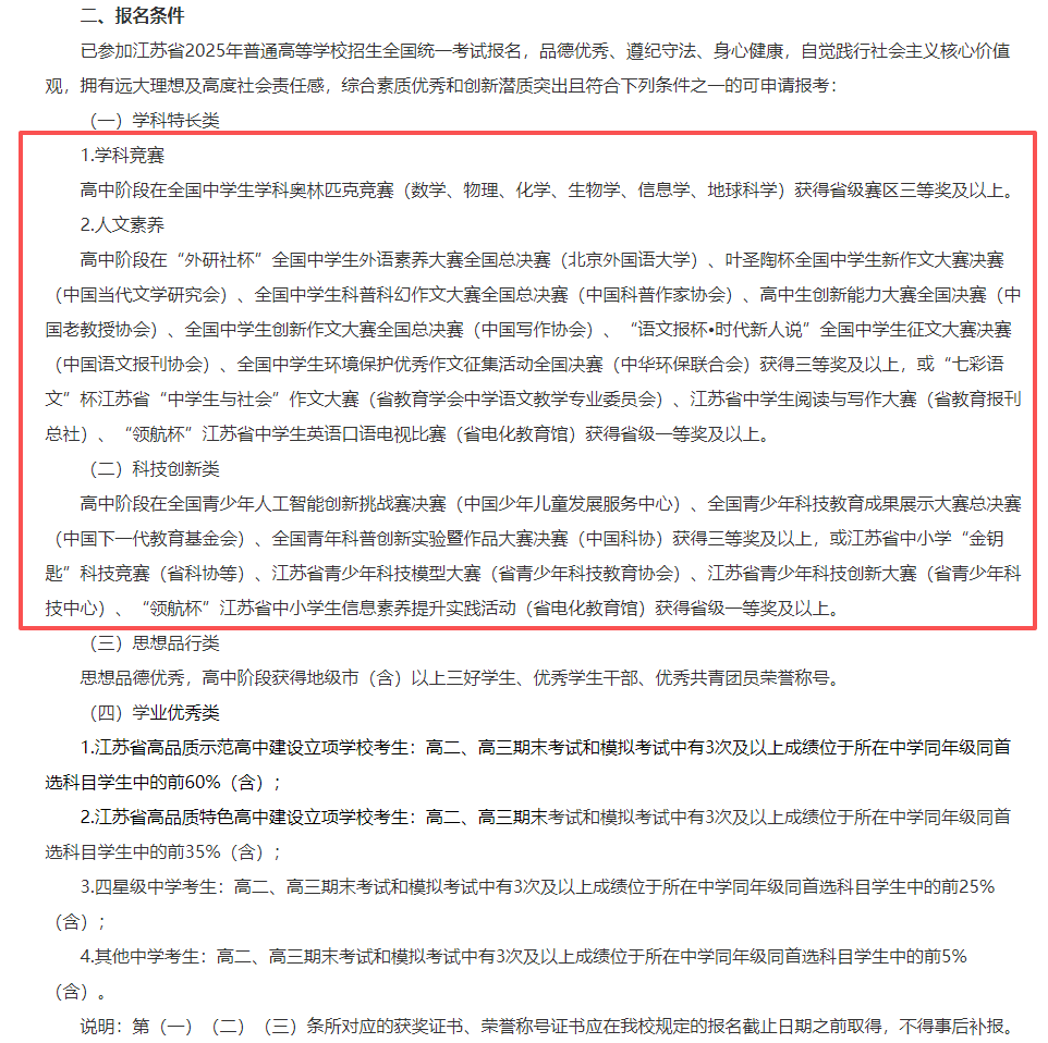 部分高校把竞赛奖项作为报考条件选项之一。如江苏大学2025年综合评价招生简章规定,满足以下报名条件之一方可报考,例如在五大学科竞赛获得省三及以上奖项即可满足报名条件。