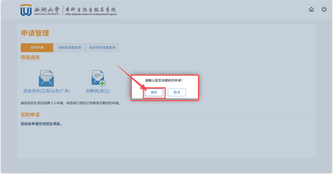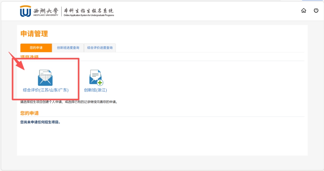 2、登录后,点击“综合评价(江苏山东广东)”,确认创建新的申请。