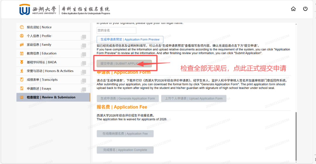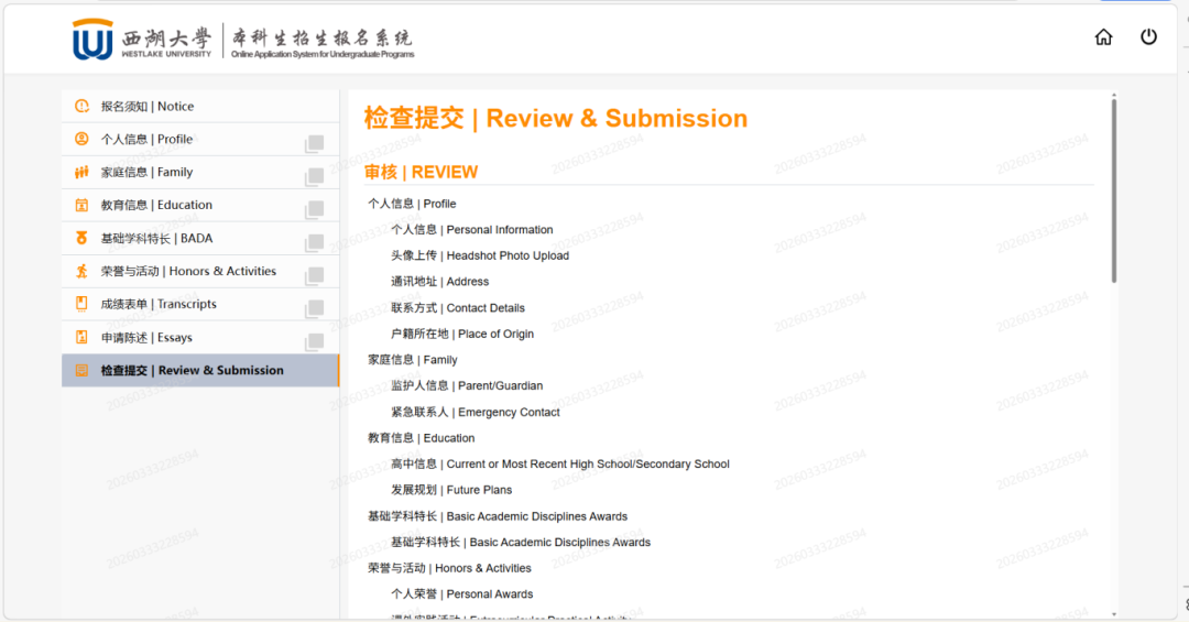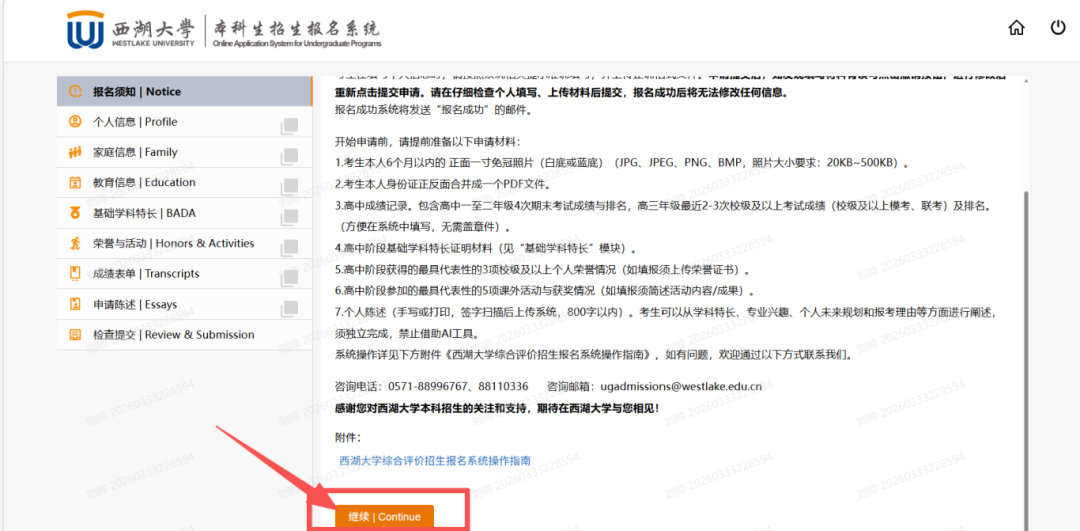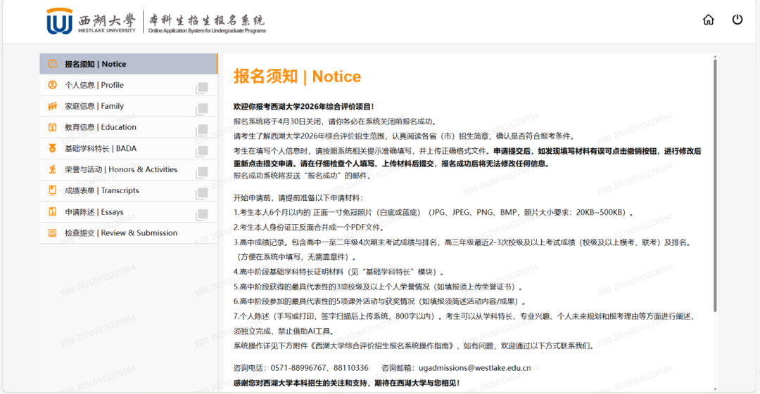注意:报名成功后,信息将无法修改(请各位家长仔细检查,确认无误后进行报名)。西湖大学综合评价报名不收取任何费用。