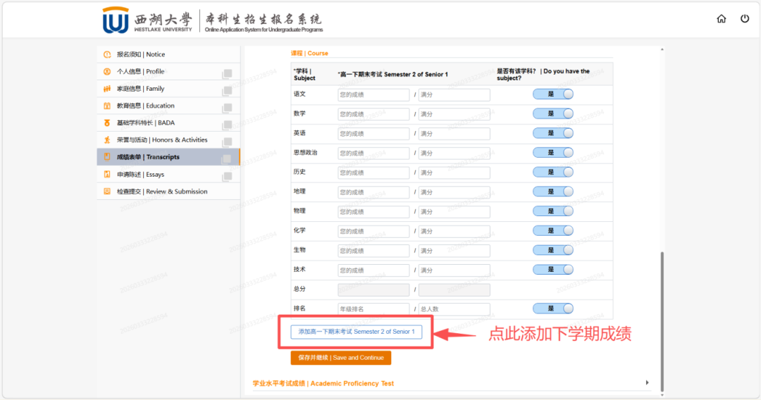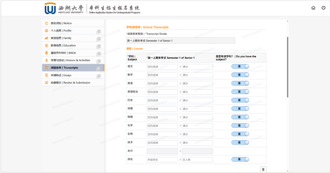 (七)填写相应年级的成绩与排名,如果以下科目中没有成绩或者没有年级排名的请在“是否有该科目?”选择“否”。