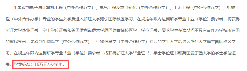 例如:浙江大学海宁国际校区的综合评价学生,学费为16万元 / 人・学年,且在规定学习期限内达到所学专业毕业(学位)要求者,将获得浙江大学毕业证书、学士学位证书和美国伊利诺伊大学厄巴纳香槟校区学士学位证书或英国爱丁堡大学学士学位证书。