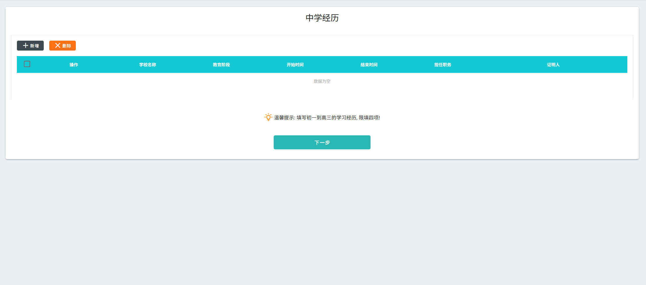 点击“新增”按钮,依次录入初中和高中学习经历。