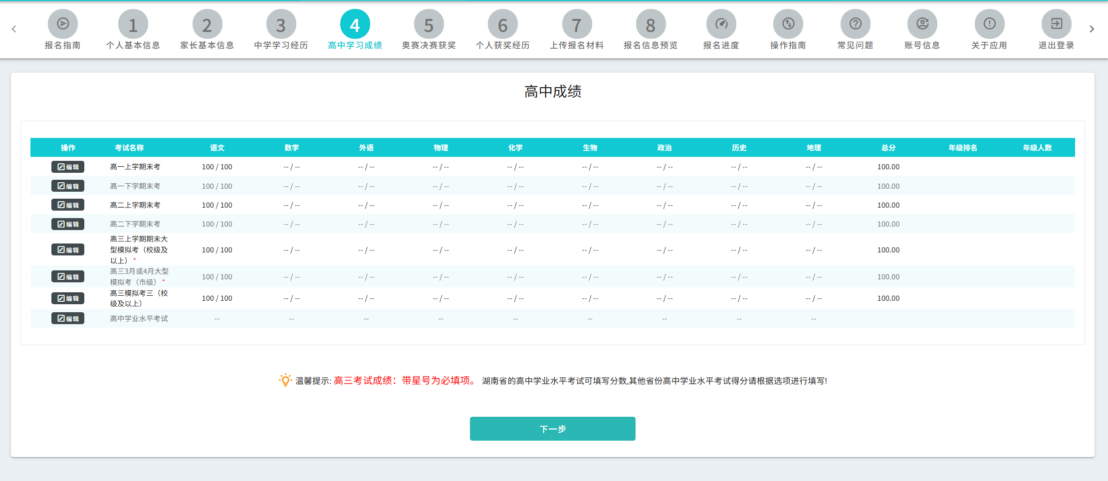 依次点击“编辑”按钮,录入高中阶段各项成绩,包括高一至高二共四个学期的期末成绩、高三上学期期末大型模拟考(校级以上)成绩、高三3月或4月大型模拟考(市级)成绩至少2次,如有3次更好。