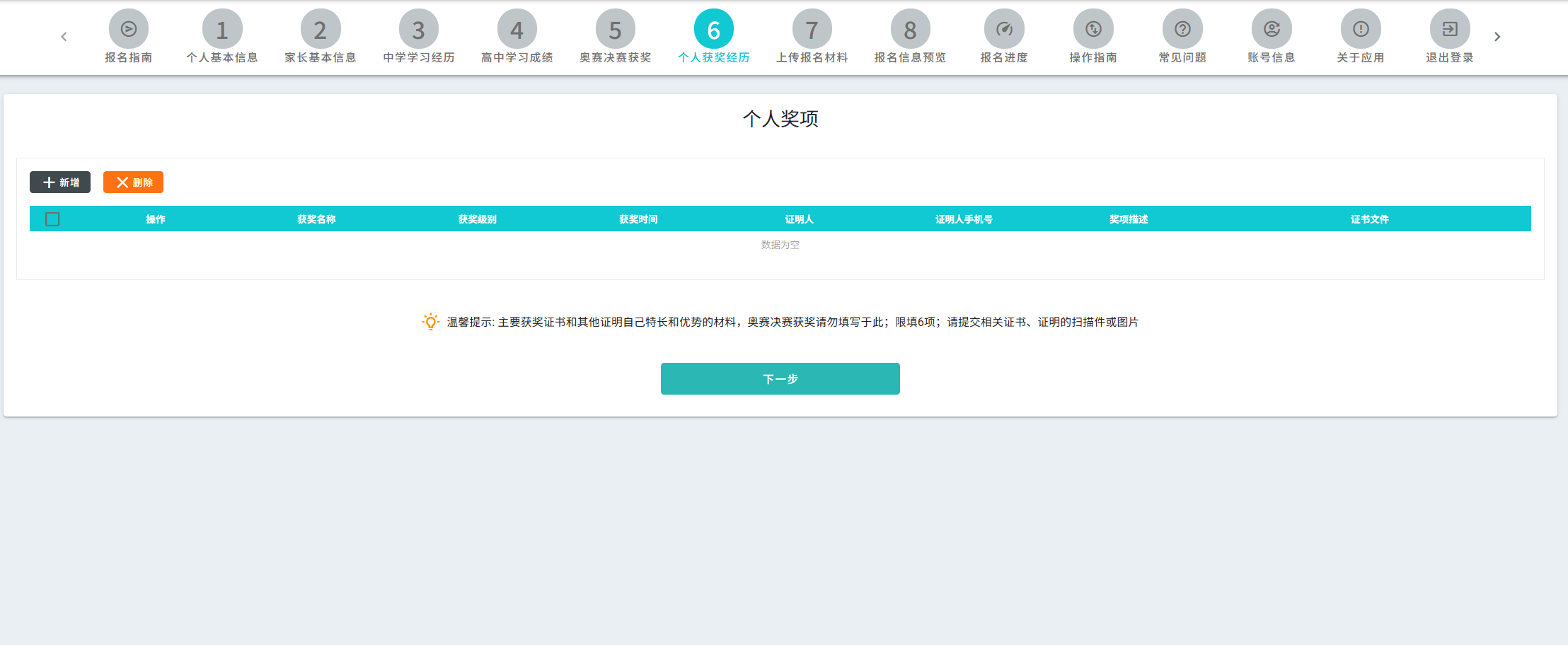 录入除奥赛全国决赛获奖外的其他个人获奖经历(包括省级奥赛奖项)、特长证明材料,并上传证书扫描件;限填6项。