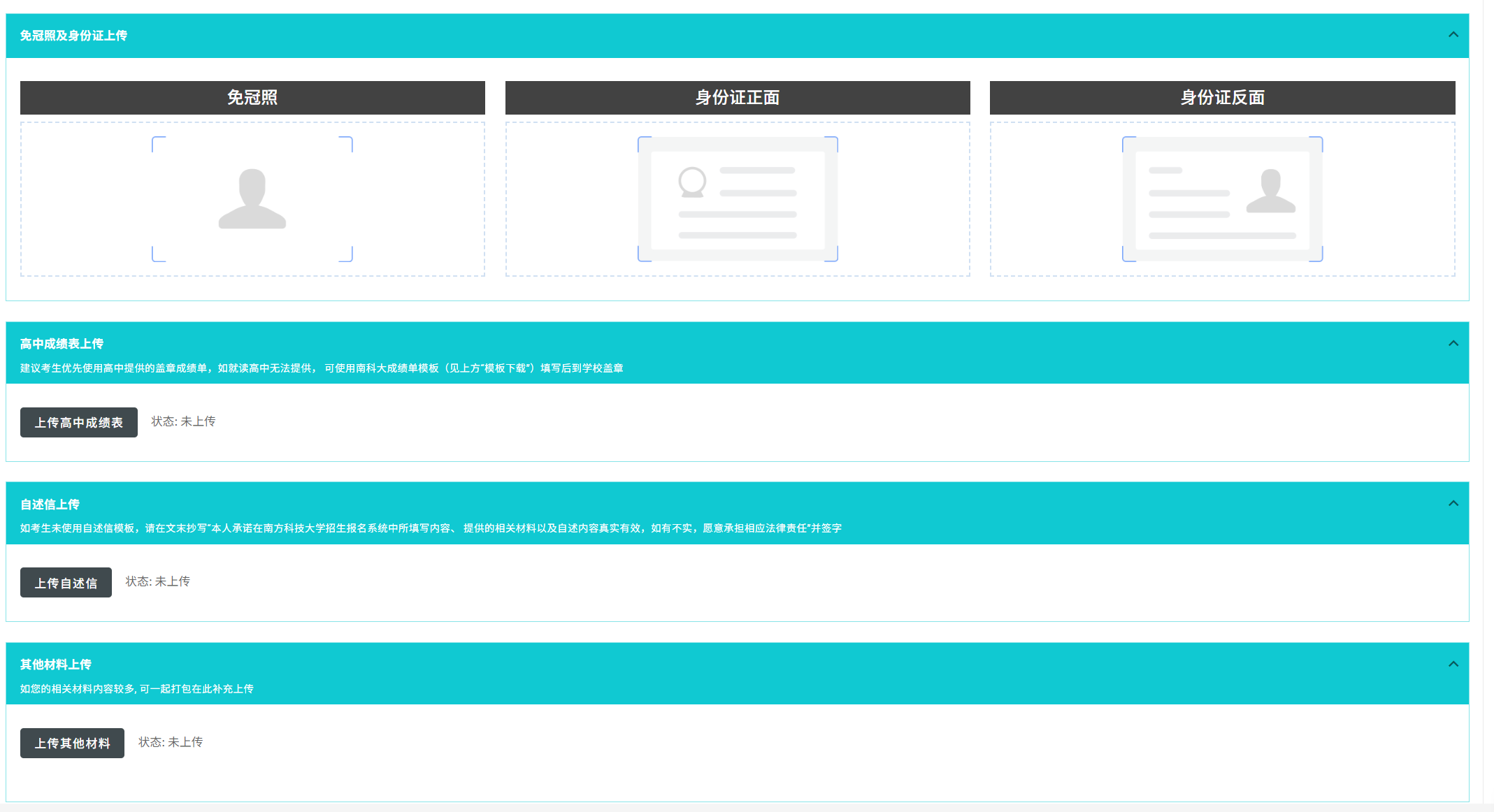 考生需要上传个人免冠照、身份证正反面照片、成绩表、自述信等文件,注意①每次上传之后都要及时保存,②请确保图片清晰,横平竖直,③所有上传文件大小均需在5MB以内。