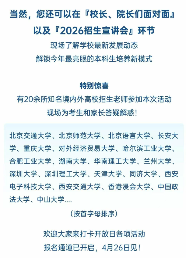依据北师香港浸会大学官微的信息,北师香港浸会大学2026年校园开放日4月26日举行,自主选拔在线团队特整理本次校园开放日流程,一起来看。