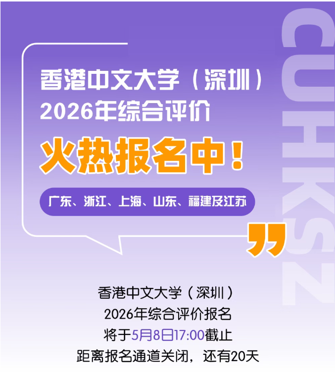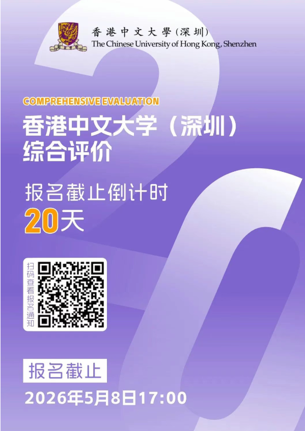 香港中文大学(深圳)综合评价报名将于2026年5月8日17:00截止,有意填报的考生、家长请合理规划系统填报时间。如报名过程中有任何疑问,可发邮件至admissions-zp@cuhk.edu.cn,或致电(0755)84273500进行咨询。综评6省(市)招生组老师也全天在群内答疑,欢迎入群了解。