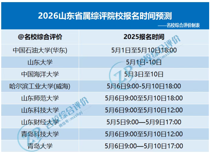 往年情况来看,山东省综合评价招生预计于5月初开始报名,以下时间节点根据2025年各高校招生简章整理制作,仅供参考!