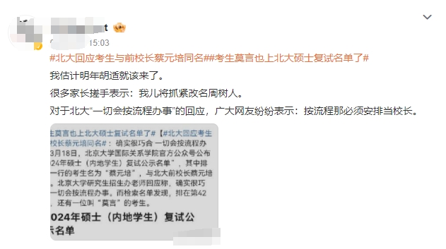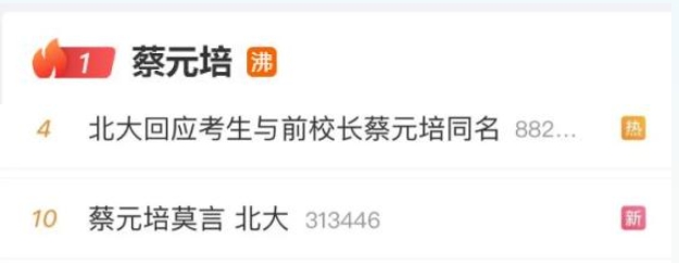 3月19日,北京大学国际关系学院日前公布的硕士复试名单中,一名考生因与北大老校长蔡元培同名同姓,引发公众关注,一度登顶微博热搜。