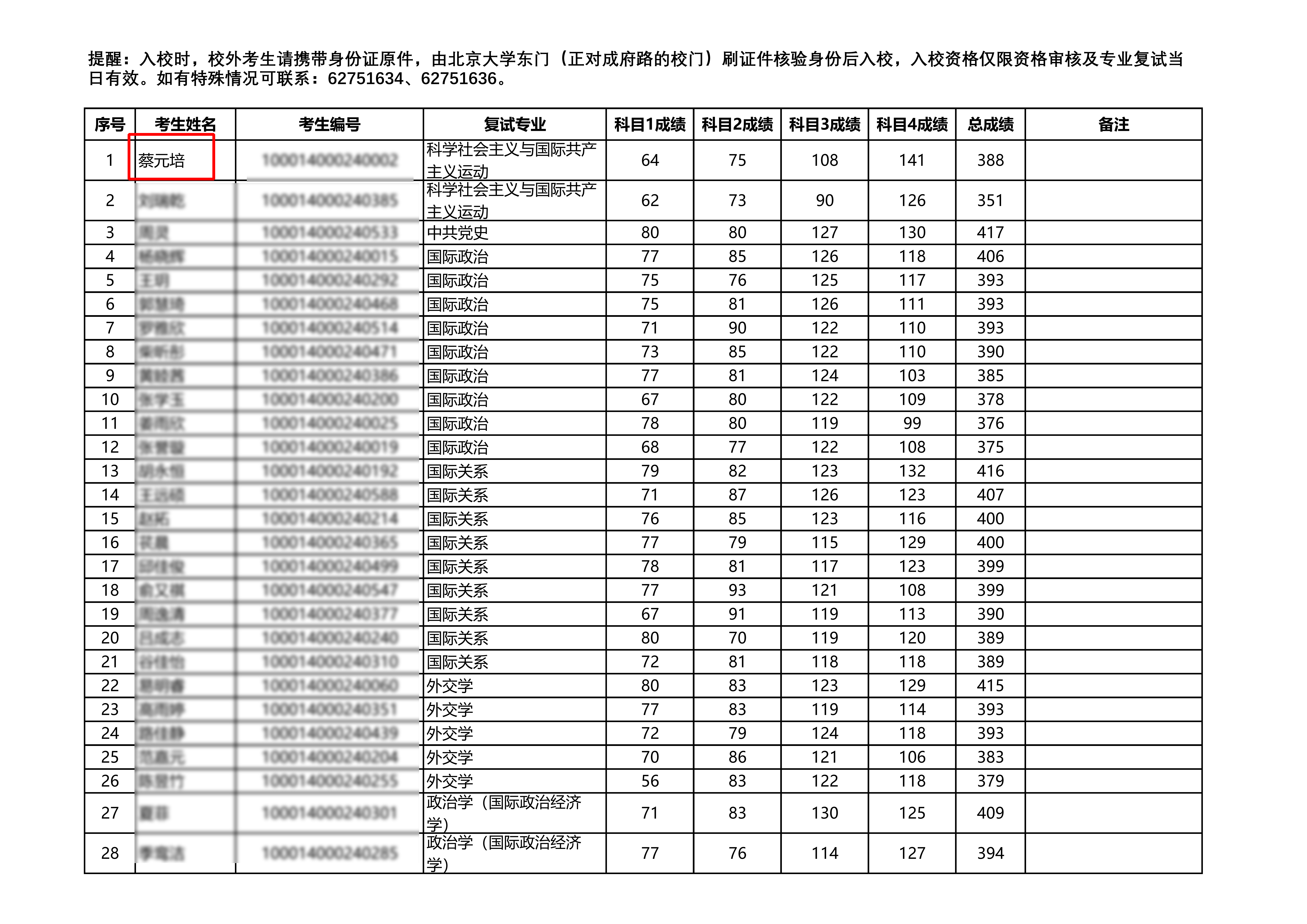 3月26日,据北京大学国际关系学院官方公众号发布,考生蔡元培初试成绩388分,复试成绩64分。总成绩73.52分是科学社会主义与国际共产主义运动专业第一。