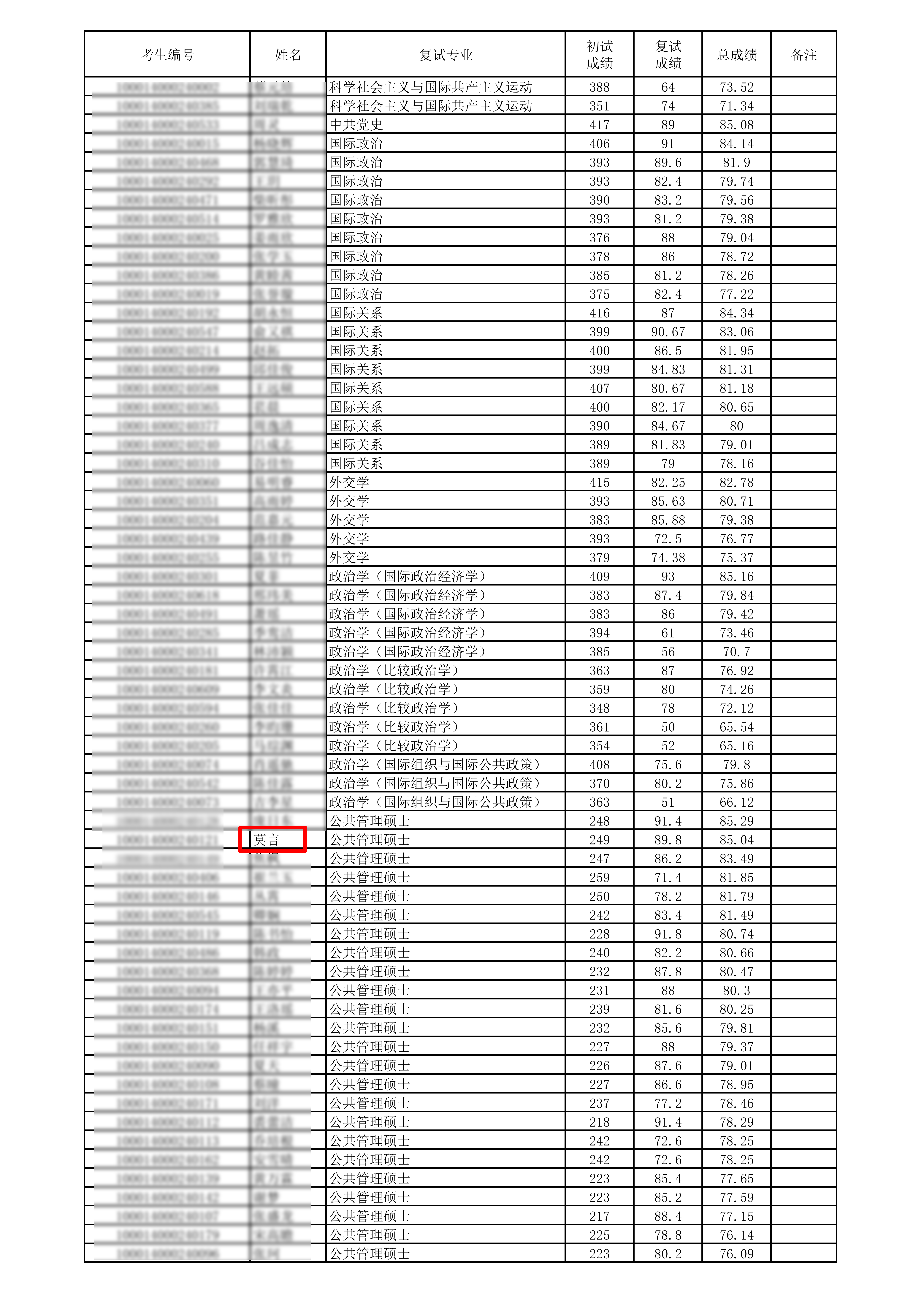 并且检索名单发现,排在第42位的,还有一位叫“莫言”的考生。考生莫言复试成绩89.8分,总成绩85.04分。总分为249分,进入了公共管理学硕士的复试。