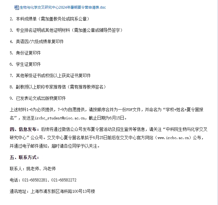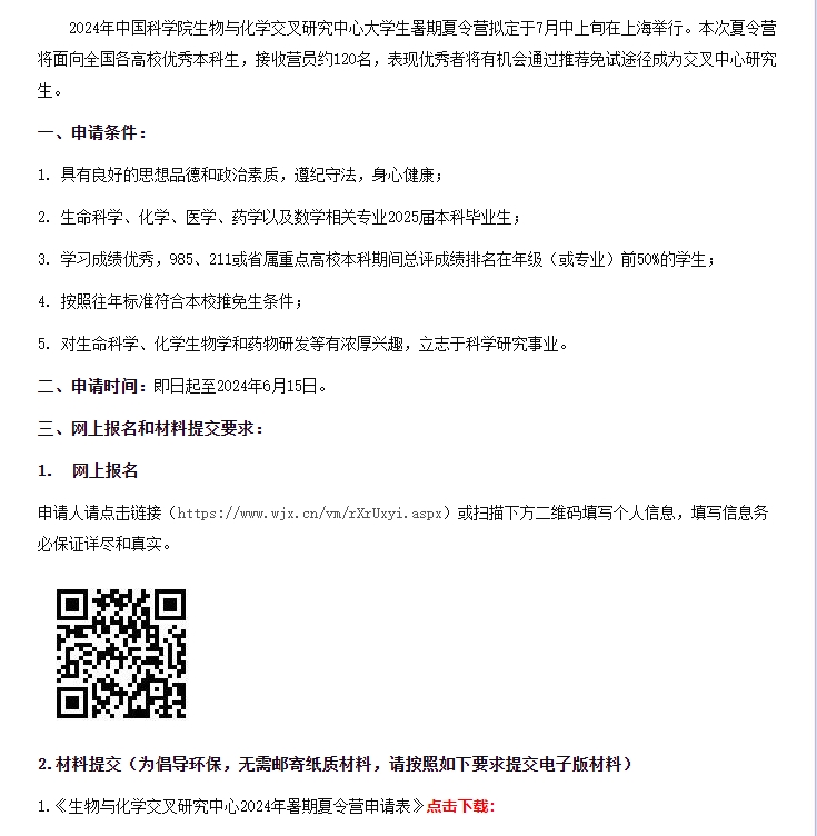 中国科学院生物与化学交叉研究中心2024年交叉中心暑期夏令营报名通知