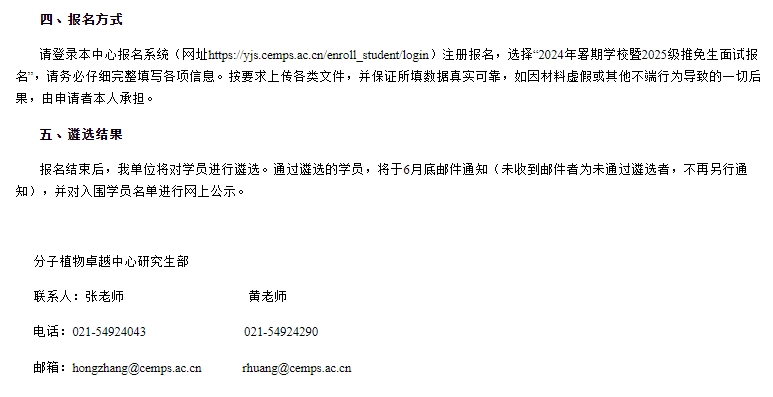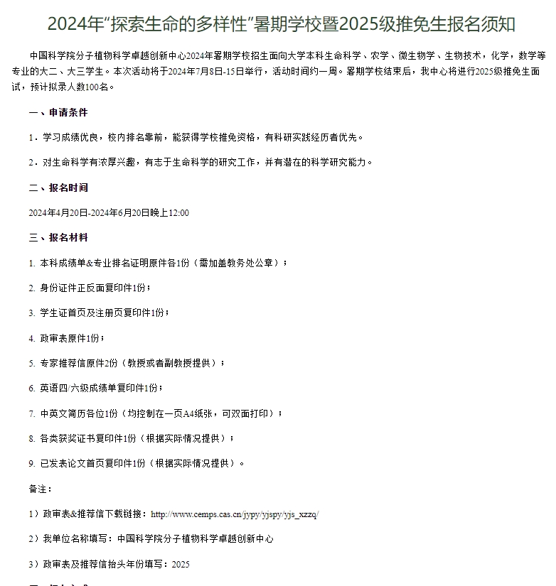 中国科学院分子植物科学卓越创新中心 2024年“探索生命的多样性”暑期学校暨2025级推免生报名须知