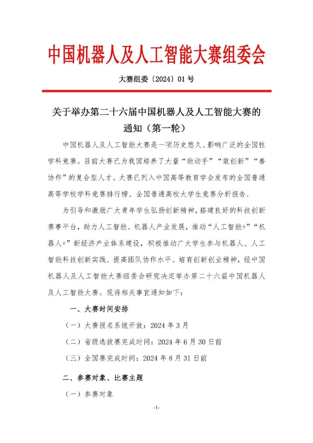 经中国机器人及人工智能大赛组委会研究决定举办第二十六届中国机器人及人工智能大赛,本文第一轮报名通知,供查看。