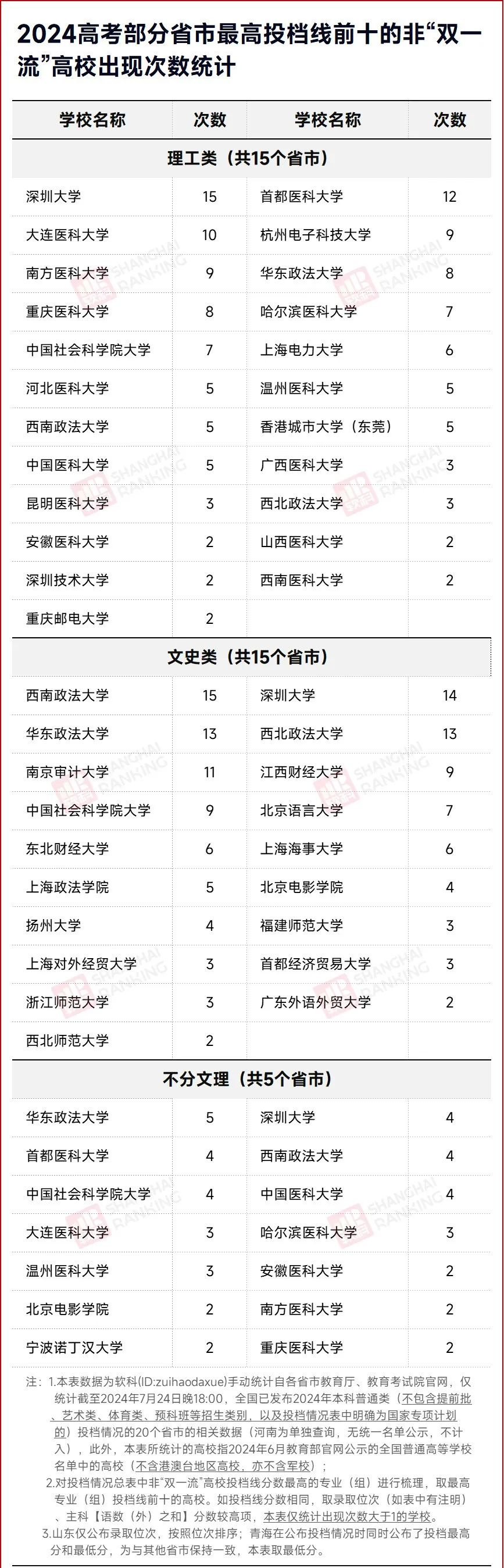 在文史类投档情况中,西南政法大学的投档线在全部15个省市中进入前十,是高分文科生们最青睐的非“双一流”高校,而深圳大学也毫不逊色,以14次的出现次数位列第二,华东政法大学和西北政法大学并列第三,各有13次出现。