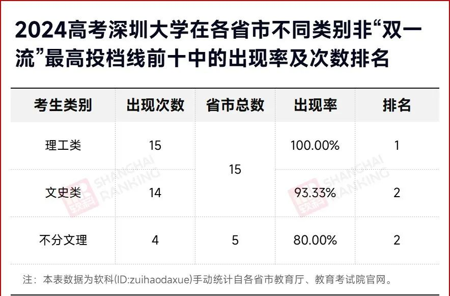 深圳大学在三类投档情况中,出现次数均位列前两名,是不折不扣的高分文科生和理科生都爱去的非“双一流”学校。