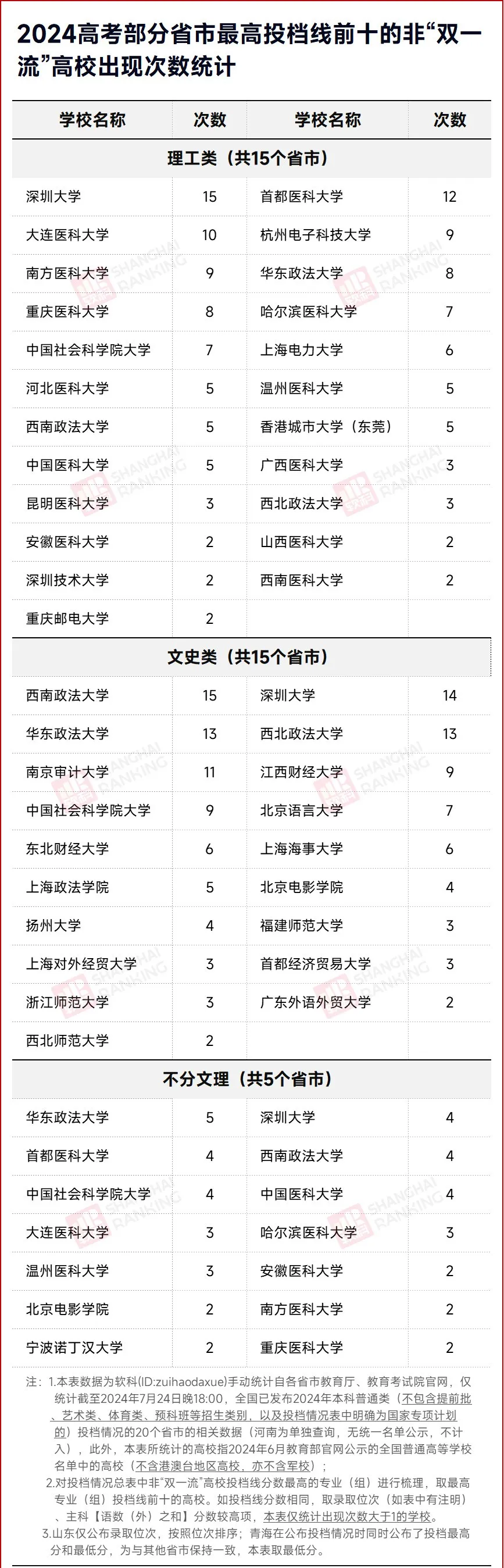在文史类投档情况中,西南政法大学的投档线在全部15个省市中进入前十,是高分文科生们最青睐的非“双一流”高校,而深圳大学也毫不逊色,以14次的出现次数位列第二,华东政法大学和西北政法大学并列第三,各有13次出现。