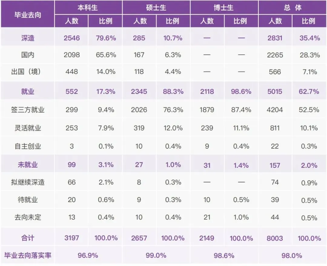 在本届毕业生中,毕业去向落实率高达98.0%。继续深造的毕业生占比为35.4%,其中选择出国深造的占比为7.1%,国内深造的占比为28.3%。大部分毕业生,即62.7%(共5015人),选择了就业道路。值得注意的是,签订三方协议的毕业生占比达到52.5%,较去年的49.3%有显著提升。