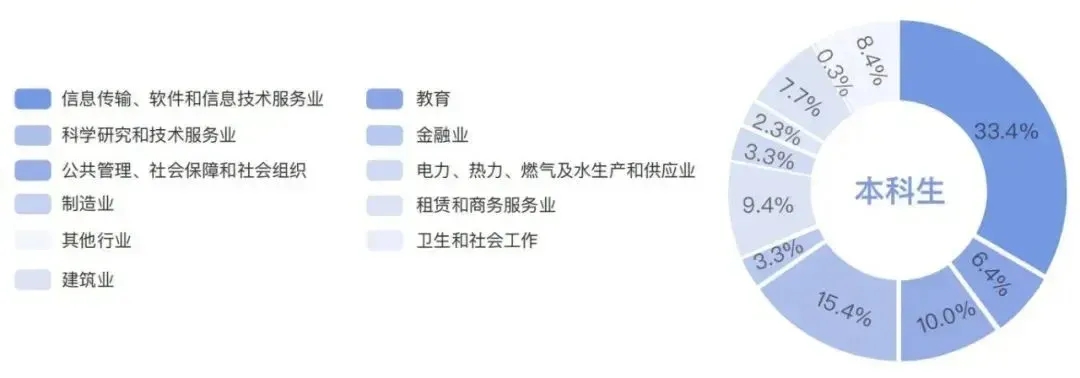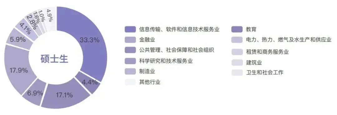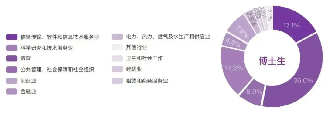 总体而言,去向排名前五的行业分别是教育(36%),科学研究和技术服务业(17.3%),信息传输、软件和信息技术服务业(17.1%),公共管理、社会保障和社会组织(8%),制造业(7.9%)。