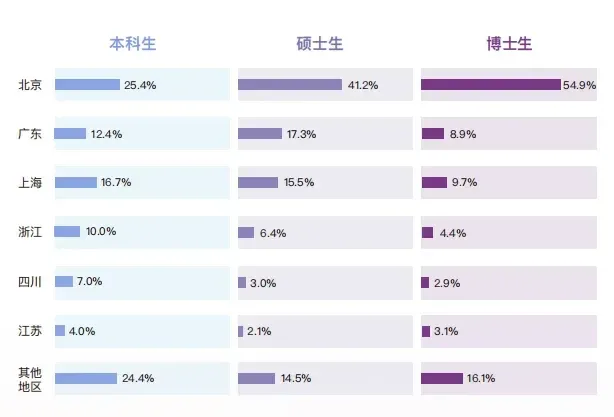 在就业城市上,无论是本科生,还是硕士生、博士生,大家留在北京的比重都是比较大的。其次是广东、上海两地。