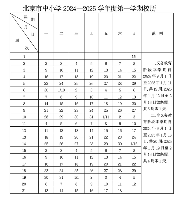 2024年9月1日(星期日)开学;2025年1月11日(星期六)结束本学期工作,共19周;2025年1月12日(星期日)至2月16日(星期日)放寒假,共5周零1天。
