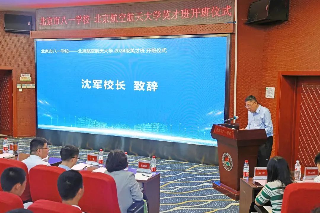 八一学校校长沈军作开讲致辞,对北京航空航天大学一直以来对八一学校创新人才培养的支持,表达了衷心感谢,对新进入英才班的同学们表示祝贺,鼓励同学们明确目标,规划好学习发展路径,顽强拼搏,以优异的成绩回报母校,未来进入国内顶尖高校继续深造。