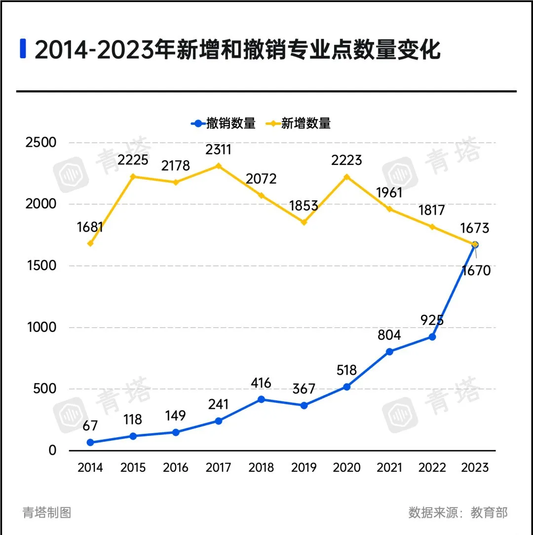 而据统计,2014年至今,全国高校每年撤销的本科专业点数量已经从67个暴涨至1670个,增长近25倍。