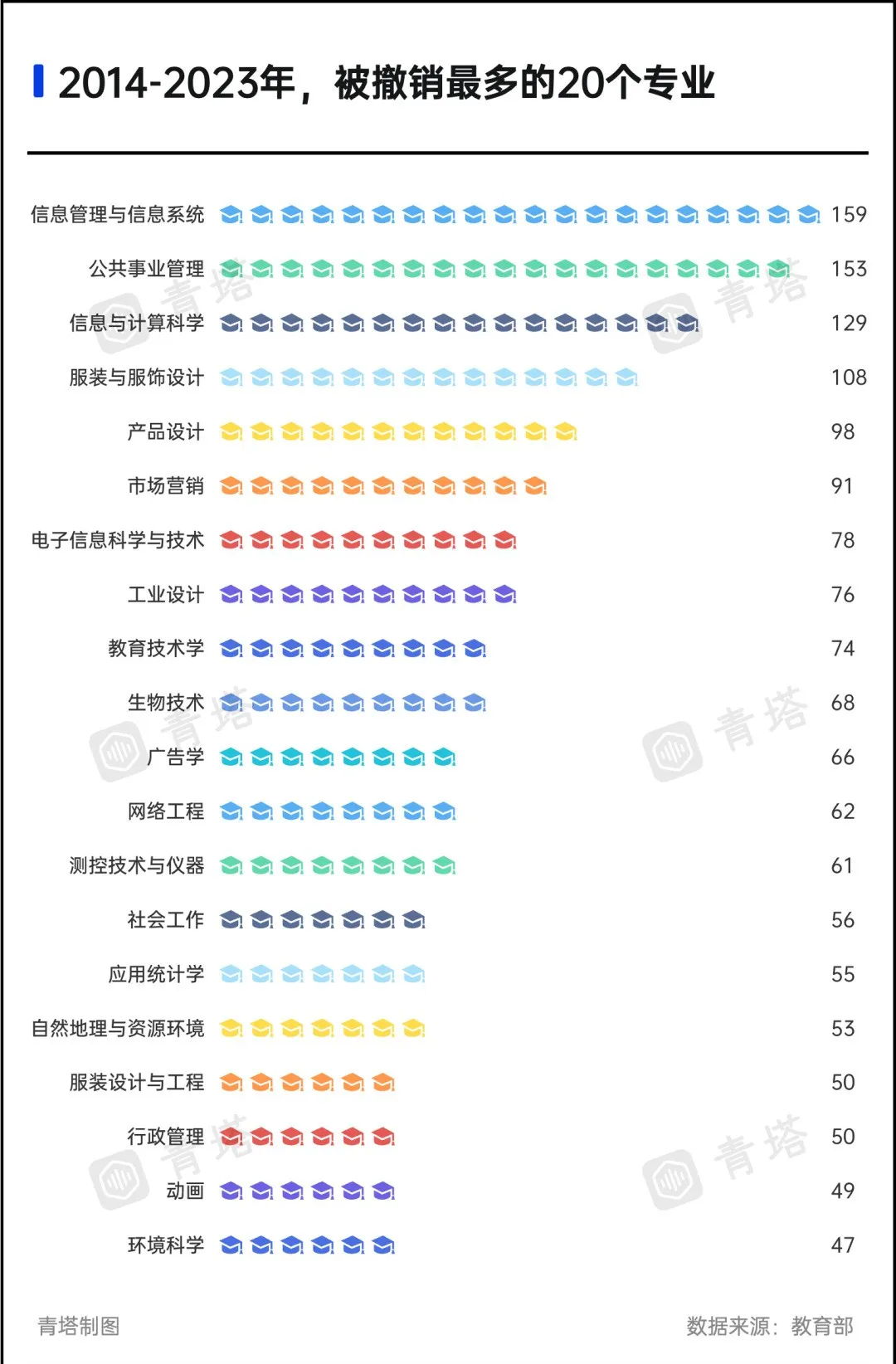 多个曾炙手可热的专业如今都已位列撤销榜前几名。排在第一位的是信息管理与信息系统专业,共有159所高校相继撤销。其次是公共事业管理、信息与计算科学、服装与服饰设计和产品设计等专业。