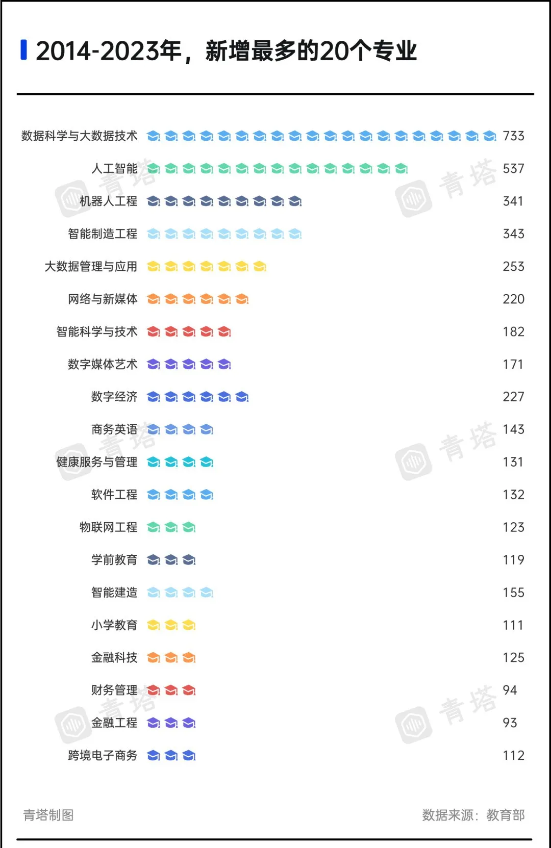 取而代之的,则是数据科学与大数据、人工智能、智能制造工程、机器人工程、大数据管理与应用等专业。其中新增最多的是数据科学与大数据专业,共有733所高校相继开设。