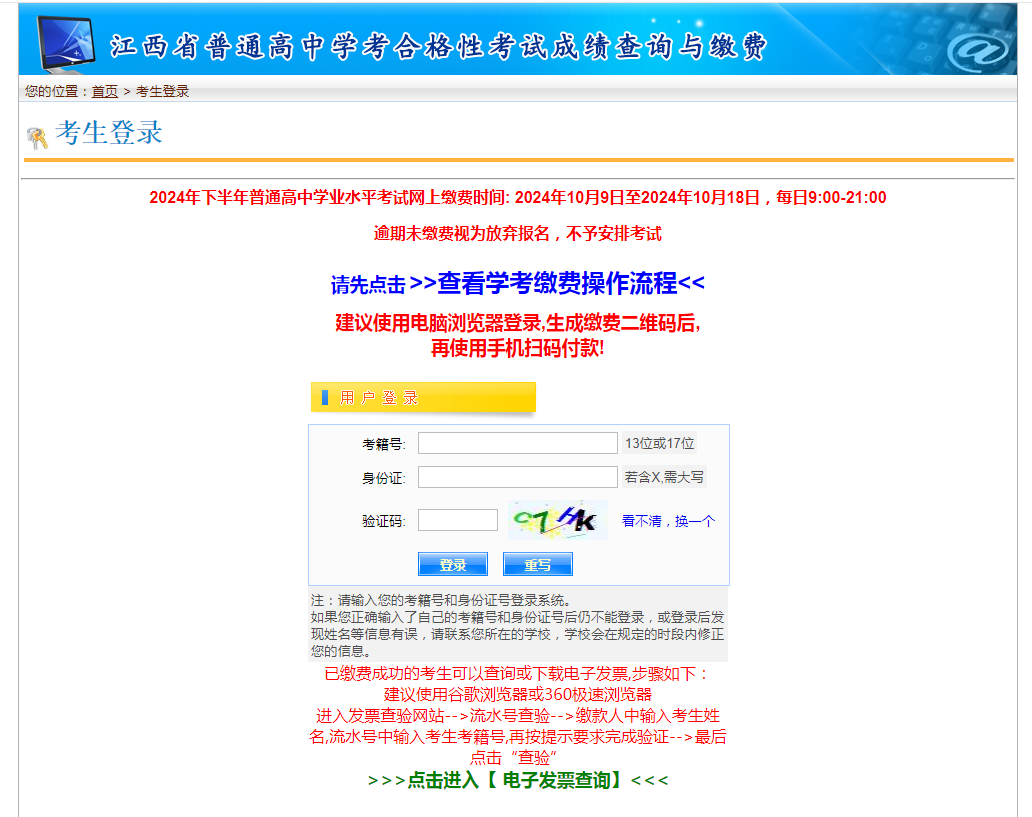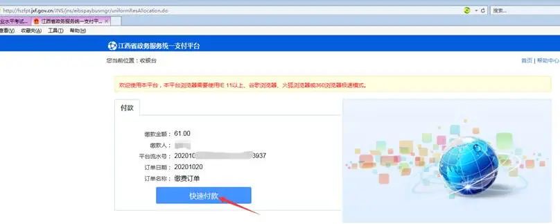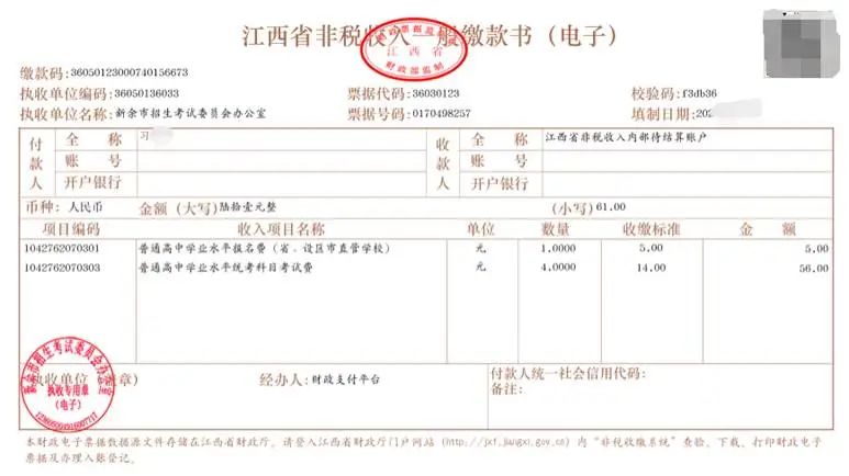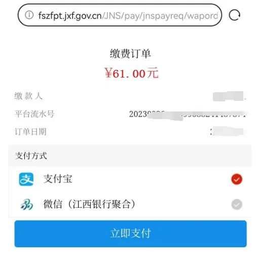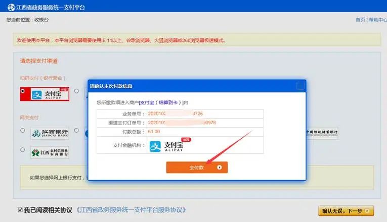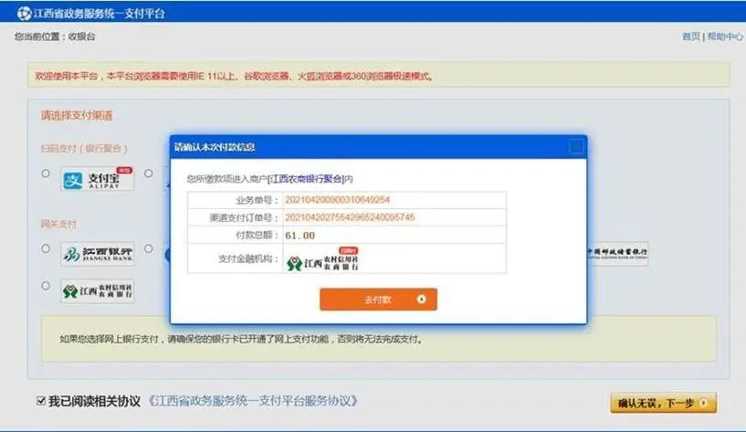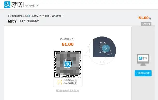 (1)选择付款方式进行付款,建议使用选择“扫码支付”(支付宝),也可以选择其他扫码方式(微信支付):江西银行、江西农商银行、江西邮政储蓄银行,可微信支付。
