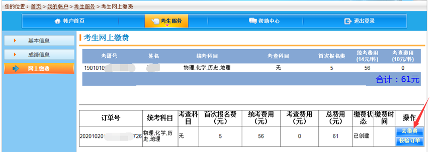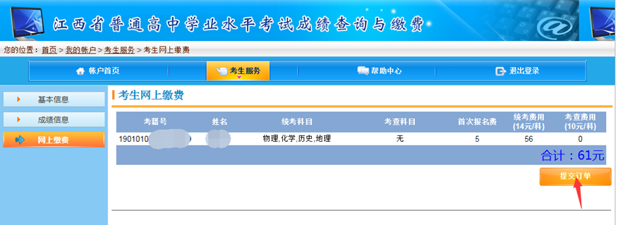 进入网上缴费菜单,首先查看考籍号和姓名是否考生本人,所报考课程和对应缴费金额已自动显示,点击“提交订单”按钮,系统会自动创建一笔交易订单,没有考试科目和缴费金额的为无需报考考生或者未报考考生。
