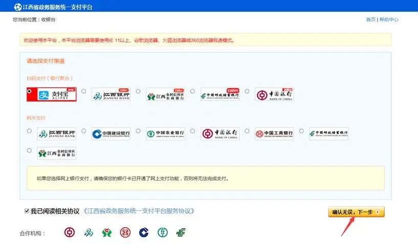 (1)扫码支付方式中,可选择江西银行、江西农商银行、江西邮政储蓄银行,任意一种,确认无误,下一步。