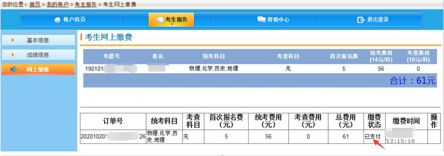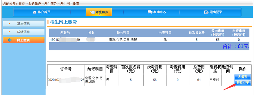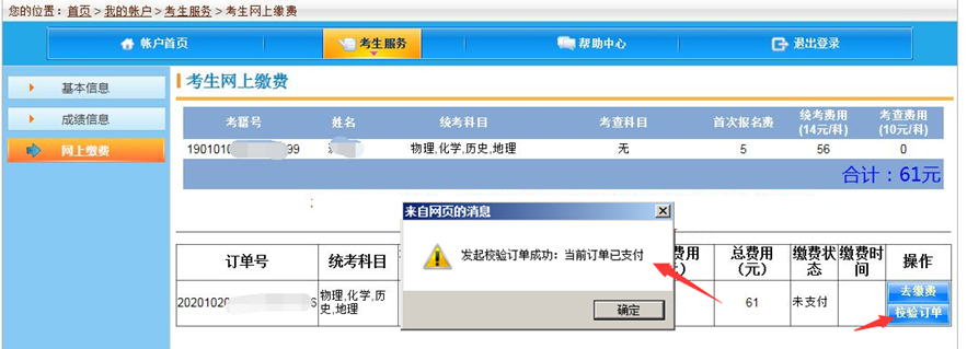 6、返回业务网站à网上缴费菜单,查看是否支付成功,即缴费状态是否变成“已支付”,还有对应缴费时间,若还是未显示“未支付”,可能网络延时,请稍后点击“校验订单”,系统会自动修复付款状态,如果银行确认已扣款,在网上缴费页面点击“校验订单”一直显示“未支付”,请告知所在学校班主任或学校信息系统管理员,并提供支付银行账号和银行扣款截图(注意:不是支付验证码)