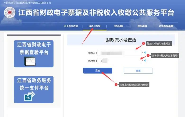进入发票查验网站-->政务服务-->非税收缴系统-->流水号查验-->缴款人中输入考生姓名-->流水号中输入考生考籍号,再按提示要求完成验证-->最后点击“查验”