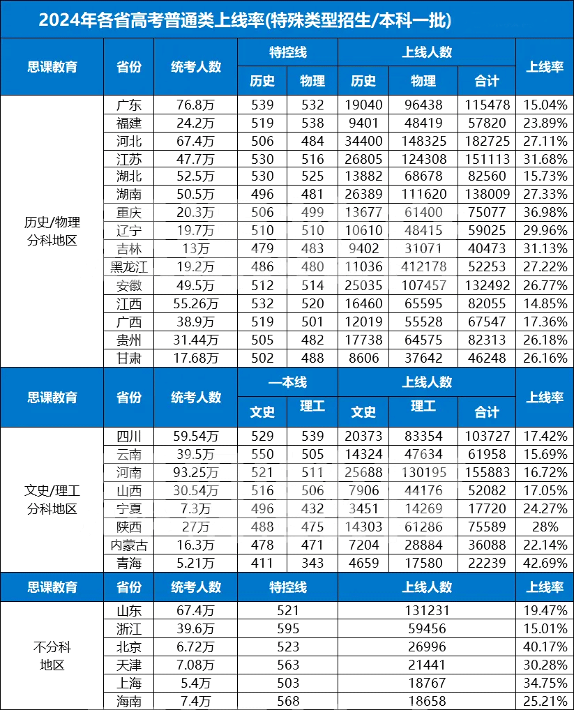 近期,2024年高考全国各省的本科及一本(特控)上线数据已相继发布。