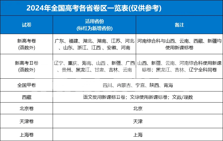 2024年高考,全国各省高考真题卷区对比2023年同期有所调整,调整后的各省所属卷区如下图所示: