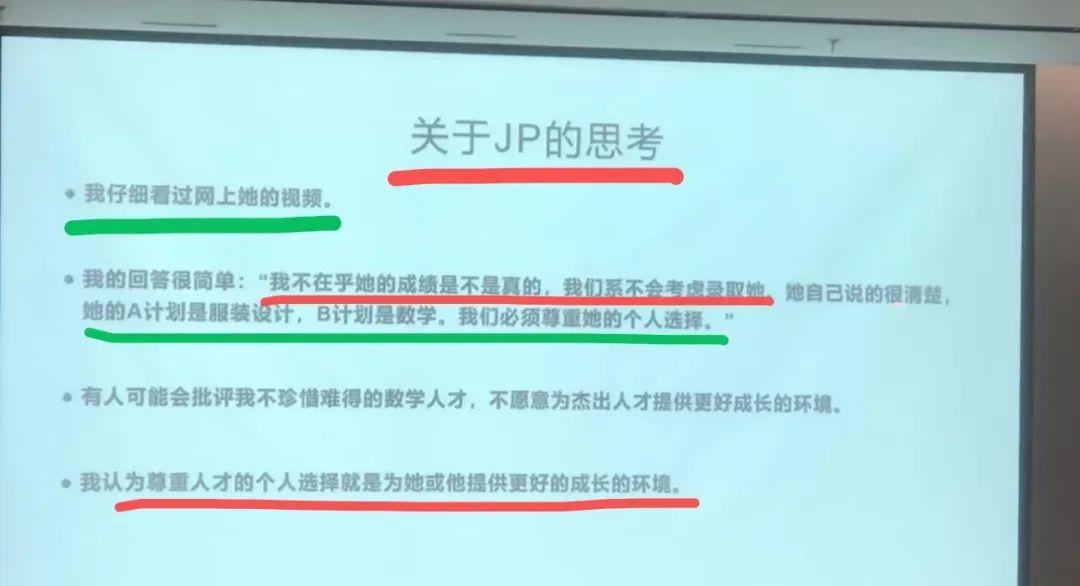 PPT中提到,我不在乎她的成绩是真是假,我们系不会录取她。因为她自己说的很清楚,A计划是学服装设计,所以必须尊重人才的个人意愿。