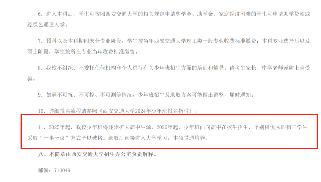 “2025年起,我校少年班将逐步扩大高中生源,2026年起,少年班面向高中在校生招生,个别极优秀的初三学生采取‘一事一议’方式予以破格。录取后直接进入大学学习,本硕贯通培养。”