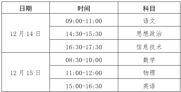 本次考试开考语文、思想政治、信息技术、数学、物理、英语6门科目。英语科目开考后不允许迟到考生进入考场,其他科目开考15分钟后不允许迟到考生进入考场。请考生牢记各科目考试时间,按时参加考试。