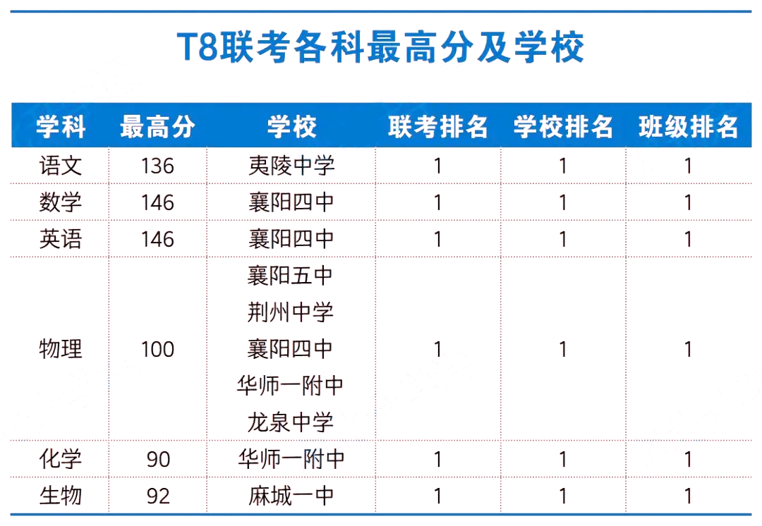 另外根据湖北升学通的消息,T8联考各科最高分: