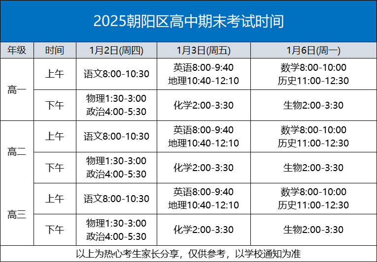 根据最新的信息,北京朝阳区2025年高三期末考试的时间已经确定,将在1月2日、3日和6日这三天进行。这意味着考试将在元旦假期结束后立即开始。为了帮助大家更好地掌握考试的详细安排,我们特别整理了相关信息,以供参考。让我们一起来看看具体的考试安排吧!