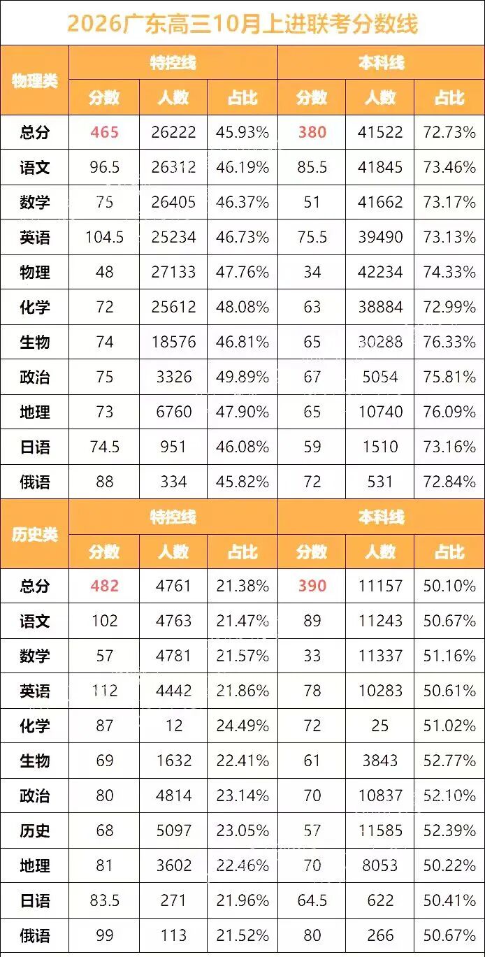 上周开考的广东高三10月上进联考分数线已经出来了,物理类特控线是465分,本科线380分;历史类特控线482分,本科线390分。自主选拔在线团队整理分数线相关内容,一起来看!