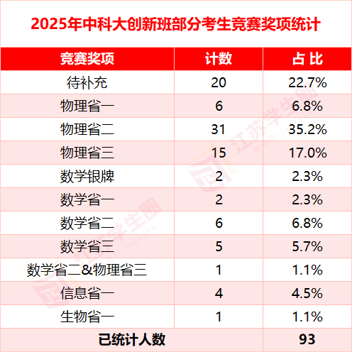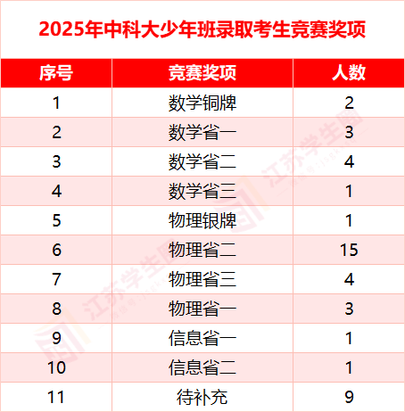少年班录取的44人中,大部分学生在五大学科竞赛的数学、物理、信息学等学科获得了较好的成绩,江苏学生圈统计了少年班考生竞赛奖项分布: