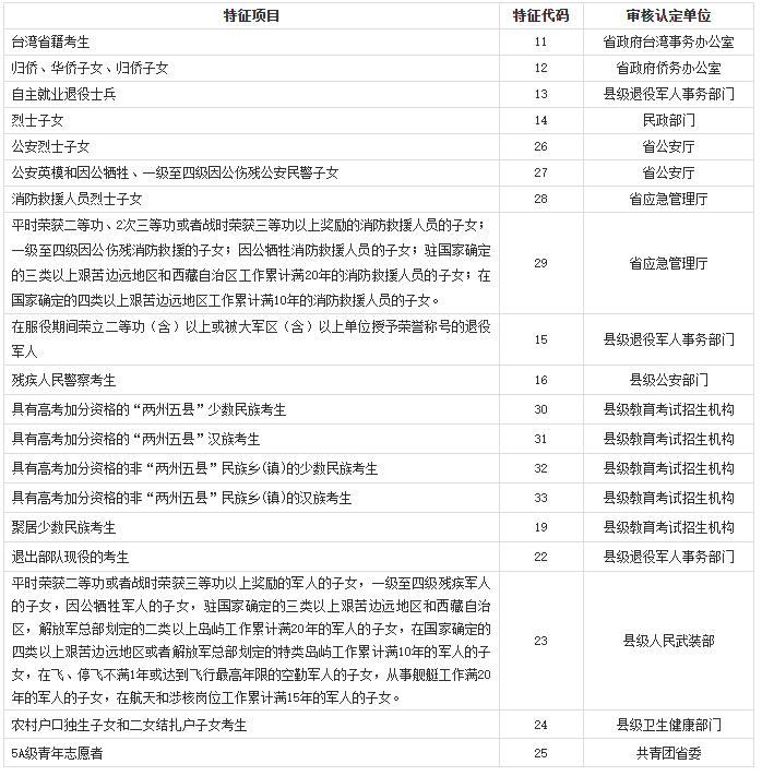 涉及照顾加分的特征项目及具体分值按照《教育部关于做好2026年普通高校招生工作的通知》《关于印发<甘肃省关于进一步深化高考加分改革工作的实施方案>的通知》(甘招委发〔2020〕9号)规定和《司法部办公厅 教育部办公厅关于参照公安机关实行司法行政机关人民警察英烈和因公牺牲伤残人民警察子女教育优待的通知》(司通办〔2020〕32号)《甘肃省教育厅甘肃省公安厅关于印发<甘肃省公安英烈和因公牺牲伤残公安民警子女教育优待工作实施细则>的通知》(甘教发〔2018〕43号)《甘肃省应急管理厅 甘肃省教育厅关于印发<甘肃省国家综合性消防救援队伍人员子女教育优待规定>的通知》(甘应急人事〔2019〕41号)相关要求执行。除残疾人民警察考生(特征代码:16)申报信息由县(市、区)级教育考试招生机构采集外,其他人民警察和消防救援人员子女教育优待对象(特征代码:26、27、28、29)信息,县(市、区)级教育考试招生机构不再重复采集,按省公安厅、省司法厅和省应急管理厅审核公示后的最终名单为准。