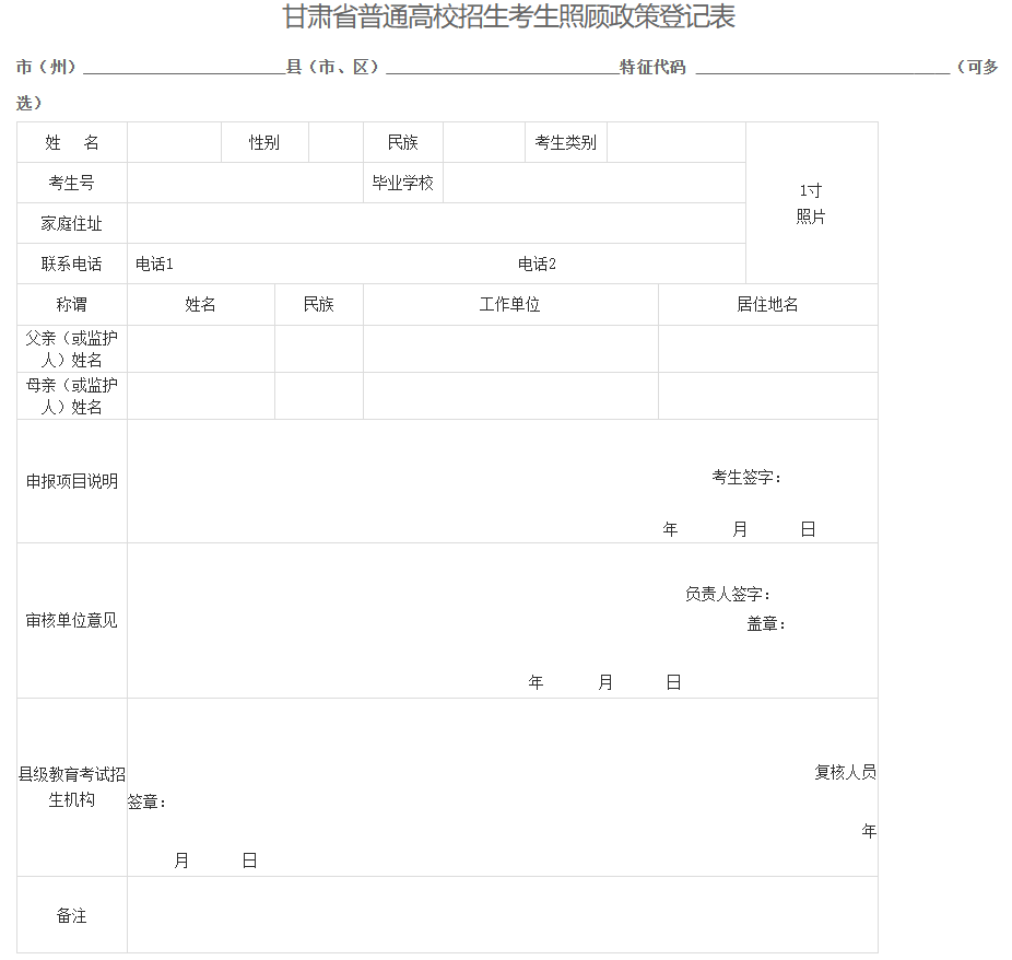 附件:甘肃省普通高校招生考生照顾政策登记表