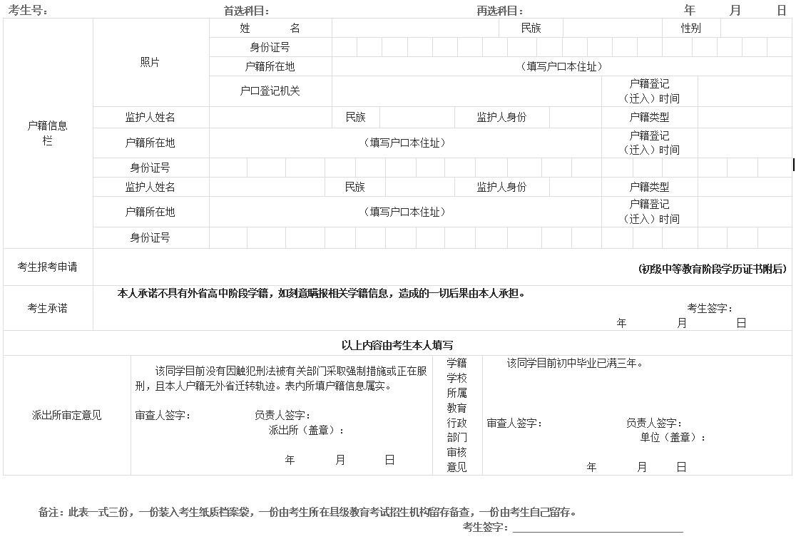 备注:此表一式三份,一份装入考生纸质档案袋,一份由考生所在县级教育考试招生机构留存备查,一份由考生自己留存。