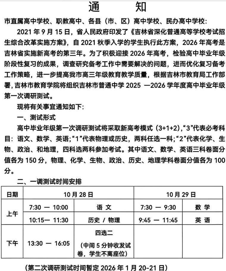 吉林一调暨吉林市高三第一次调研测试的时间安排已经公布。此次重要的联考将于10月28日至29日举行。下午我们为大家带来此次吉林一调的具体考试时间安排,以便各位考生能够提前做好充分的准备。